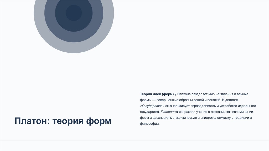 Теория идей (форм) у Платона разделяет мир на явления и вечныеформы — совершенные образцы вещей и понятий. В диалоге