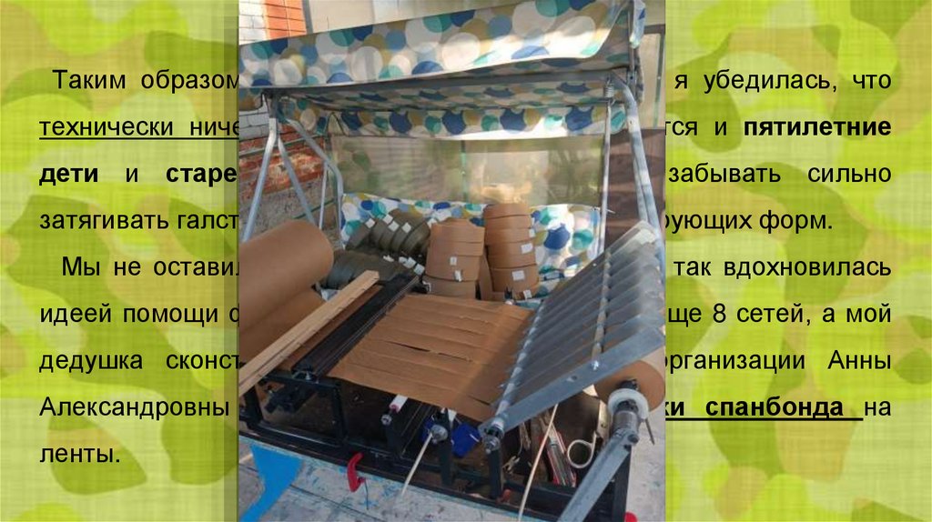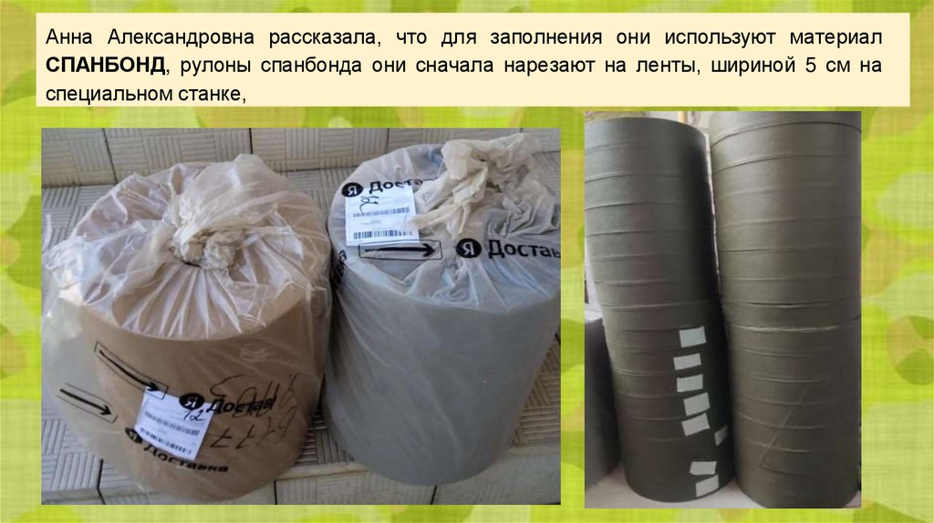 Анна Александровна рассказала, что для заполнения они используют материалСПАНБОНД, рулоны спанбонда они сначала нарезают на ленты, шириной 5 см на