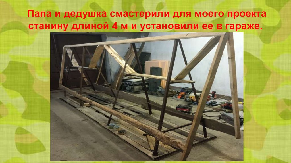 Папа и дедушка смастерили для моего проектастанину длиной 4 м и установили ее в гараже.