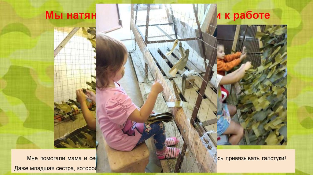 Мы натянули сеть и приступили к работеМне помогали мама и сестры, им по 5 лет и у них отлично получилось привязывать галстуки!
