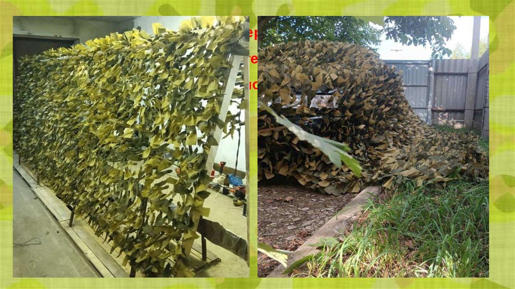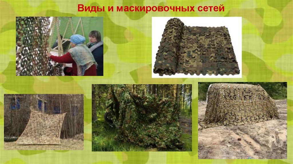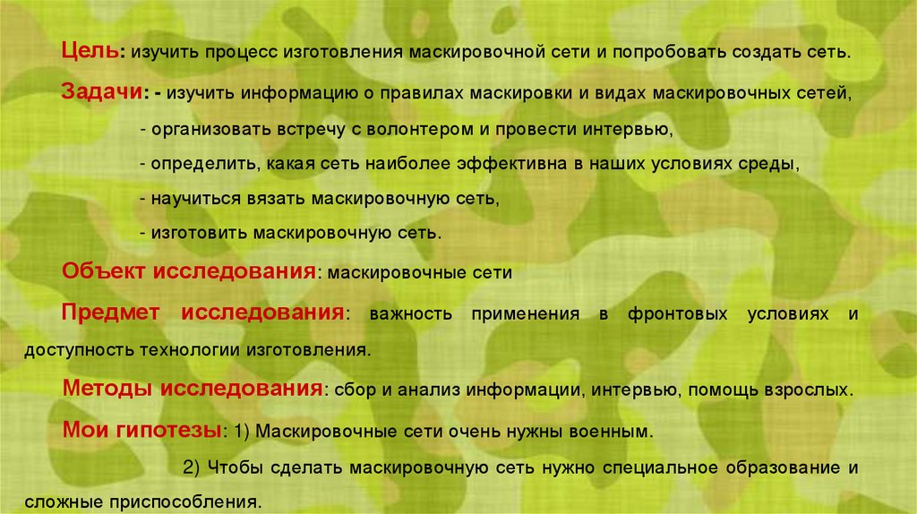 Цель: изучить процесс изготовления маскировочной сети и попробовать создать сеть.Задачи: - изучить информацию о правилах маскировки и видах маскировочных сетей,