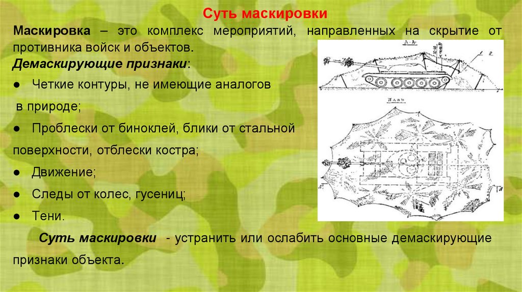 Суть маскировкиМаскировка – это комплекс мероприятий, направленных на скрытие от