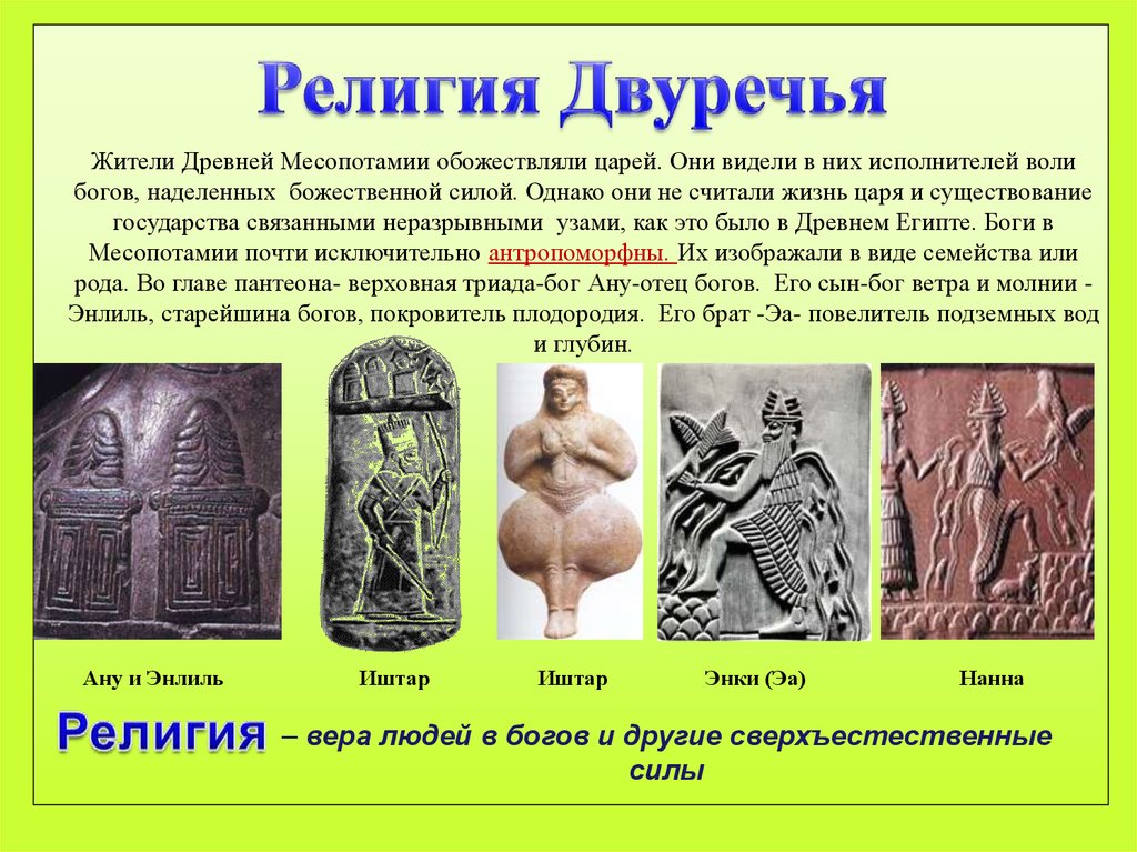 рода. Во главе пантеона- верховная триада-бог Ану-отец богов. Его сын-бог ветра и молнии Энлиль, старейшина богов, покровитель плодородия. Его брат -Эа- повелитель подземных вод