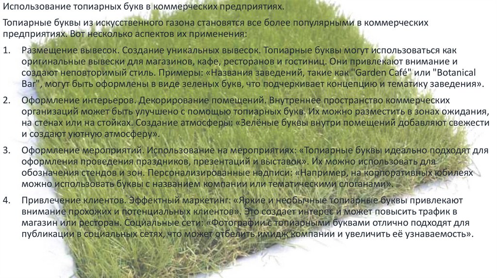 Использование топиарных букв в коммерческих предприятиях.Топиарные буквы из искусственного газона становятся все более популярными в коммерческих