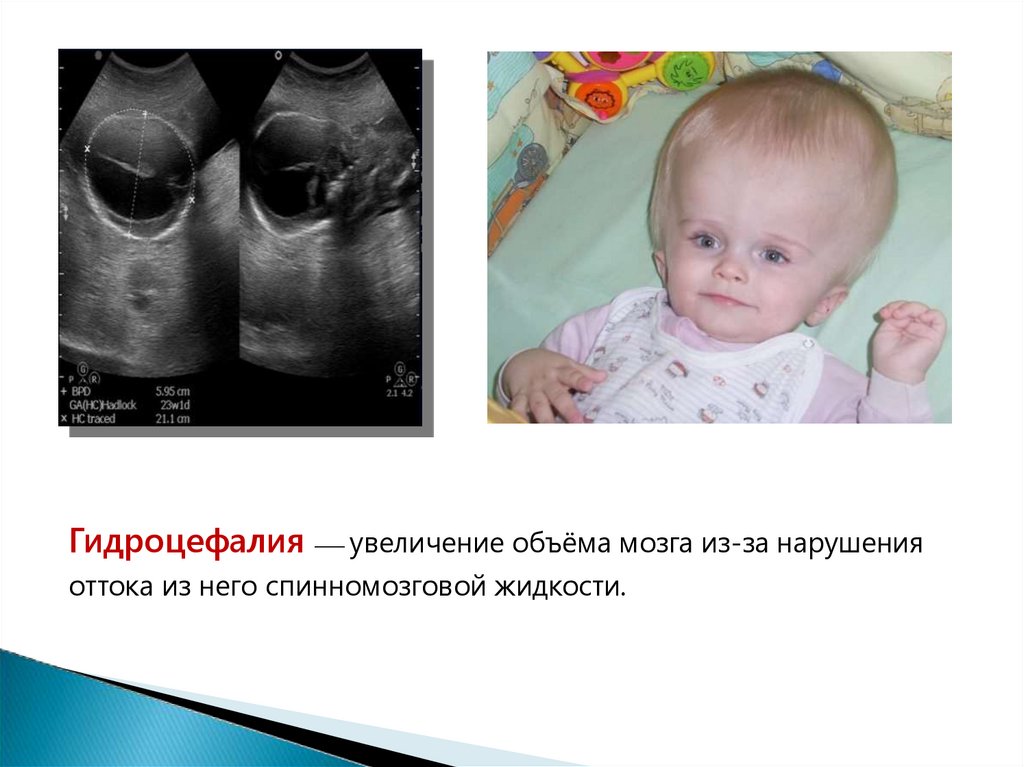 Гидроцефалия —– увеличение объёма мозга из-за нарушенияоттока из него спинномозговой жидкости.