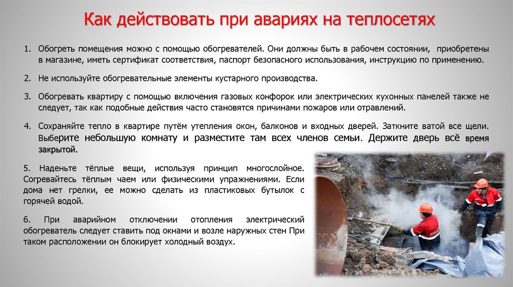 Как действовать при авариях на теплосетях1. Обогреть помещения можно с помощью обогревателей. Они должны быть в рабочем состоянии, приобретены