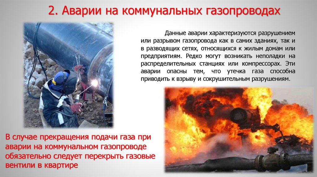 2. Аварии на коммунальных газопроводахДанные аварии характеризуются разрушением