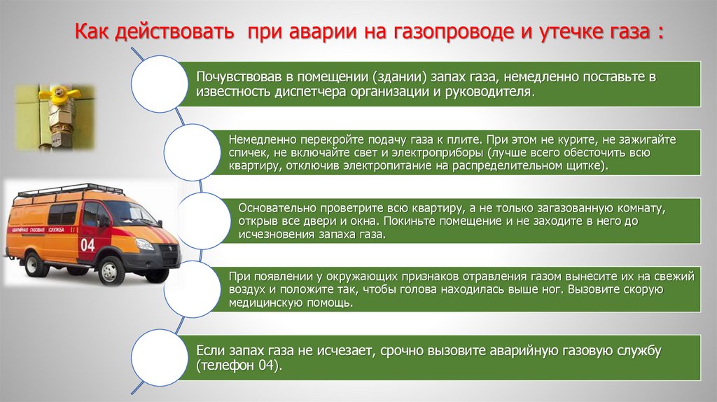 Как действовать при аварии на газопроводе и утечке газа :Почувствовав в помещении (здании) запах газа, немедленно поставьте в