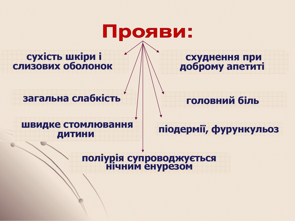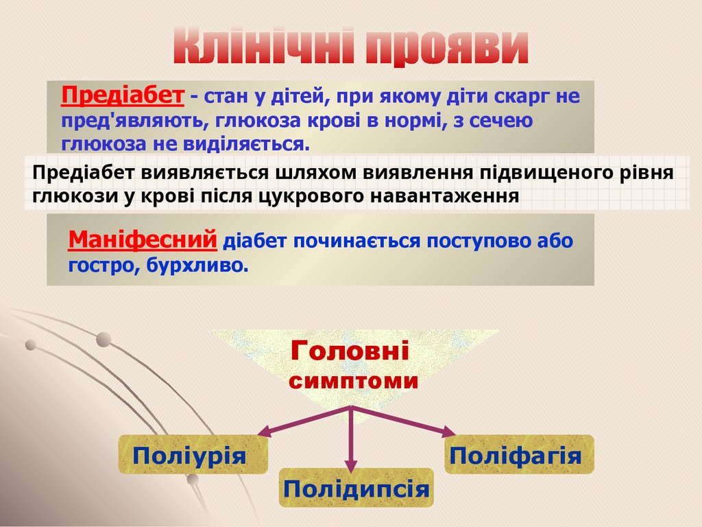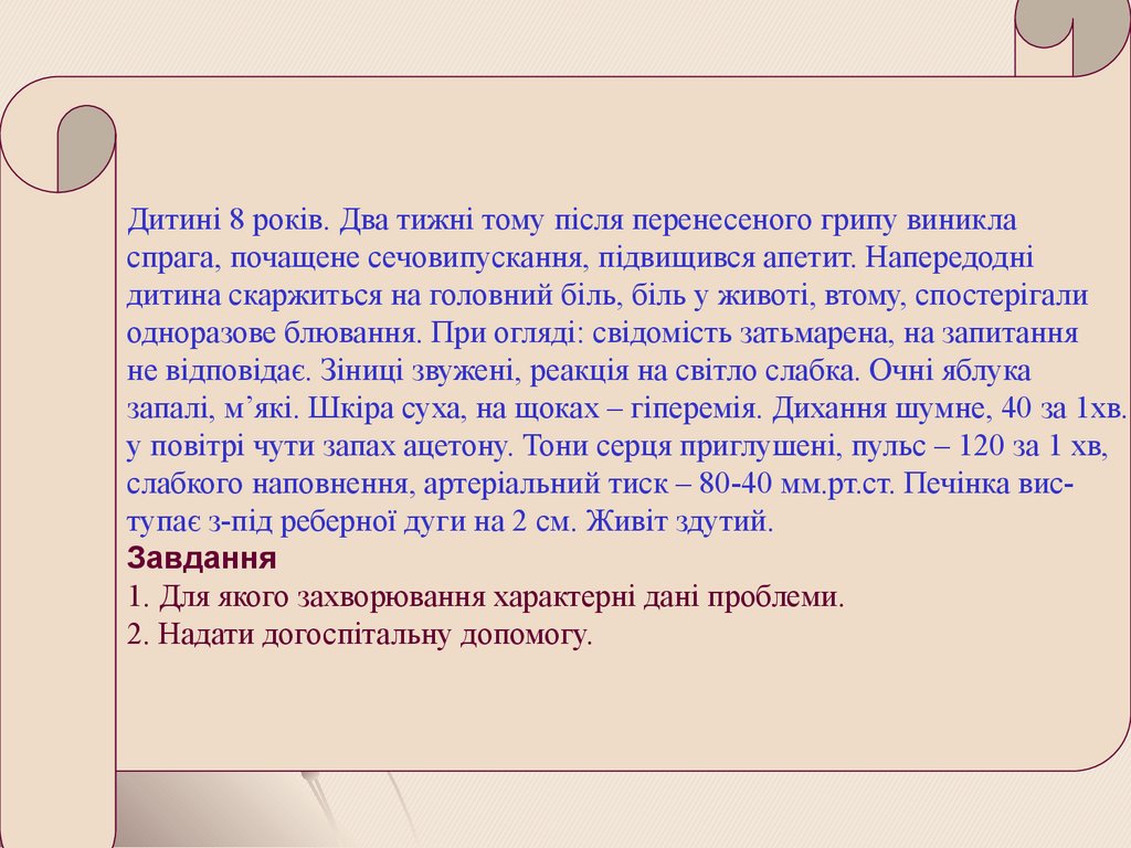 Дитині 8 років. Два тижні тому після перенесеного грипу виникласпрага, почащене сечовипускання, підвищився апетит. Напередодні