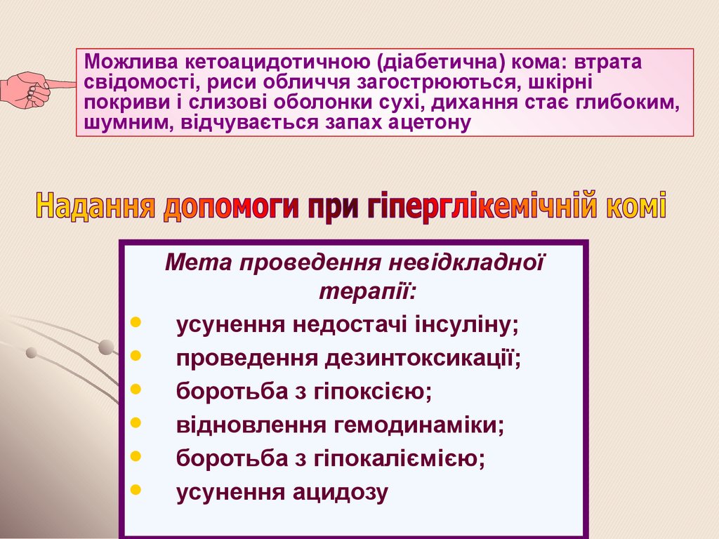 у повітрі чути запах ацетону. Тони серця приглушені, пульс – 120 за 1 хв,