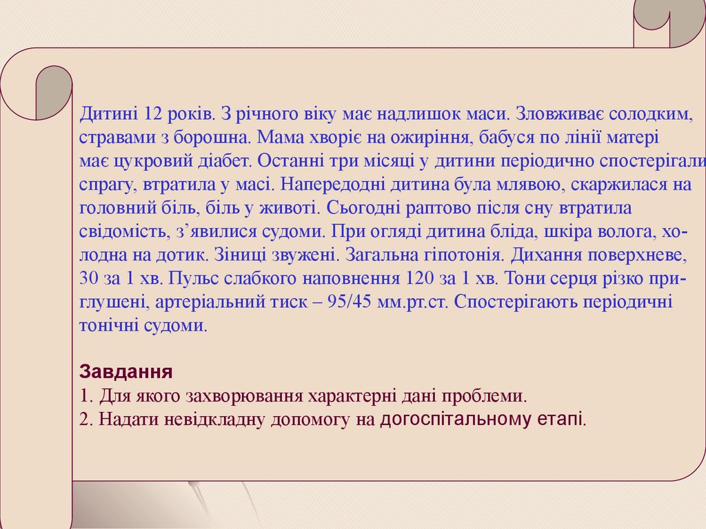 свідомість, з’явилися судоми. При огляді дитина бліда, шкіра волога, холодна на дотик. Зіниці звужені. Загальна гіпотонія. Дихання поверхневе,