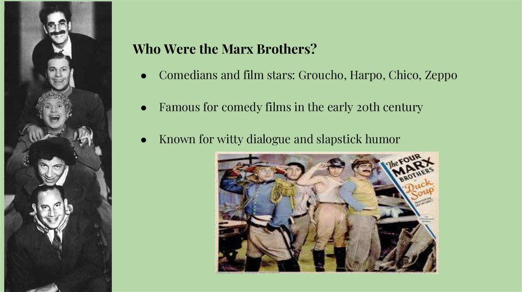 Who Were the Marx Brothers?Comedians and film stars: Groucho, Harpo, Chico, Zeppo