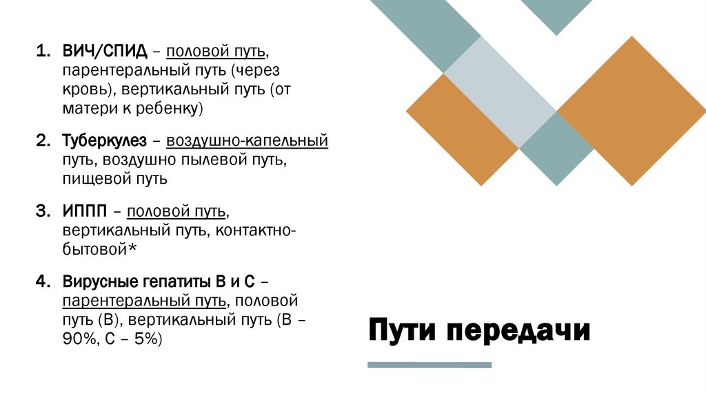 1. ВИЧ/СПИД – половой путь,парентеральный путь (через