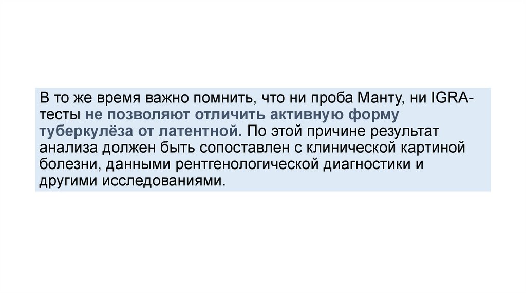 В то же время важно помнить, что ни проба Манту, ни IGRAтесты не позволяют отличить активную формутуберкулёза от латентной. По этой причине результат