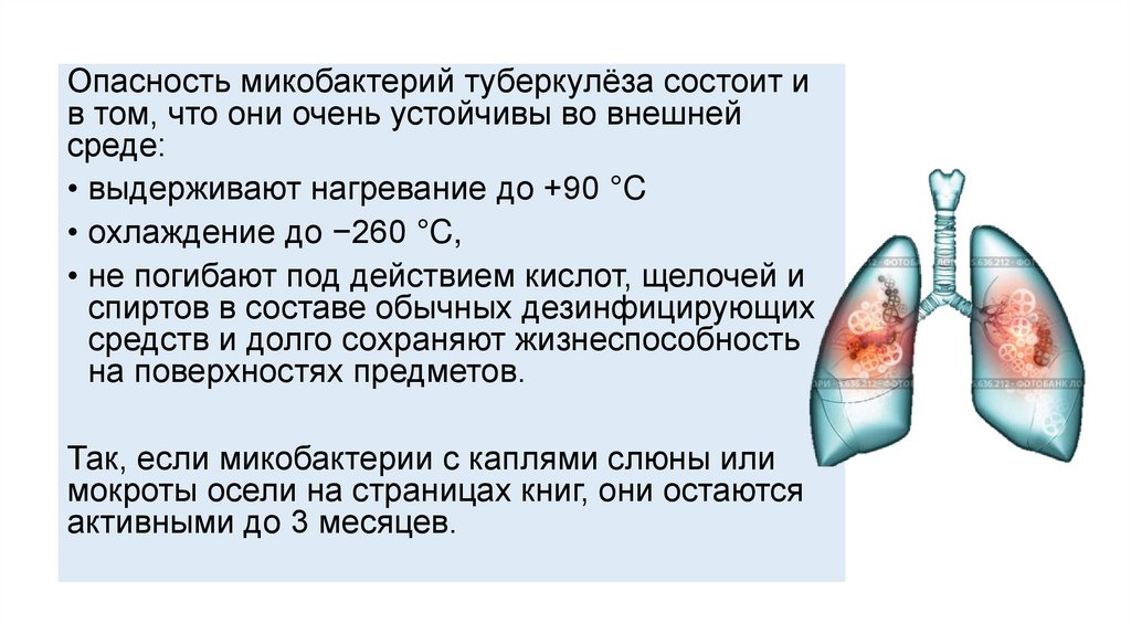 Опасность микобактерий туберкулёза состоит ив том, что они очень устойчивы во внешней