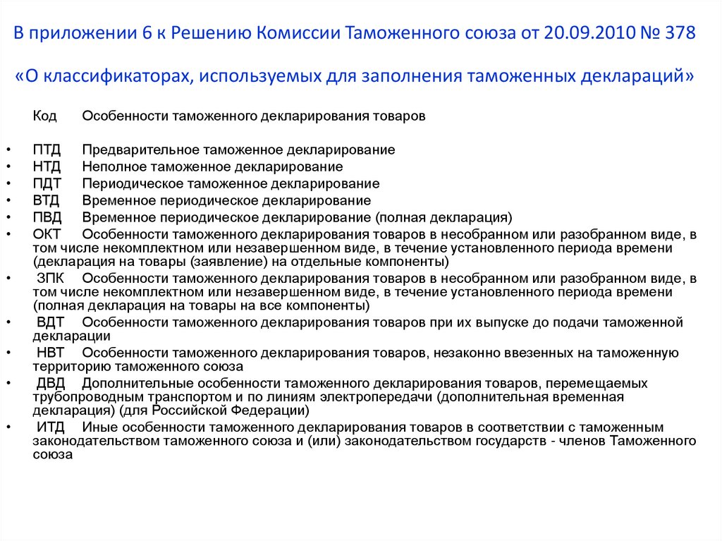 В приложении 6 к Решению Комиссии Таможенного союза от 20.09.2010 № 378«О классификаторах, используемых для заполнения таможенных деклараций»