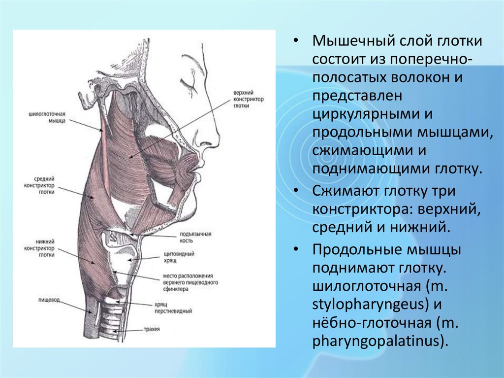 • Мышечный слой глоткисостоит из поперечнополосатых волокон и