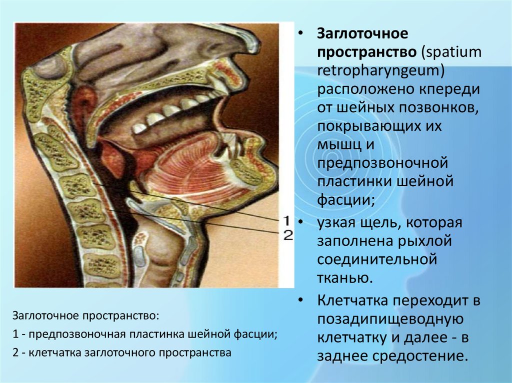 Заглоточное пространство:1 - предпозвоночная пластинка шейной фасции;