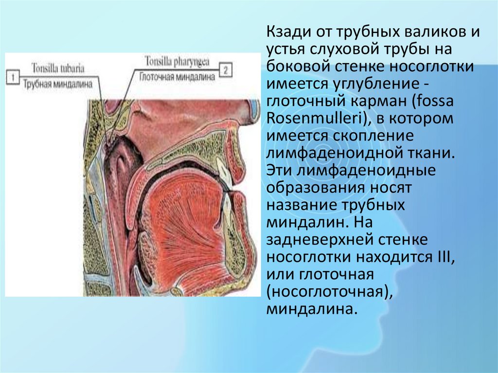 Кзади от трубных валиков иустья слуховой трубы на