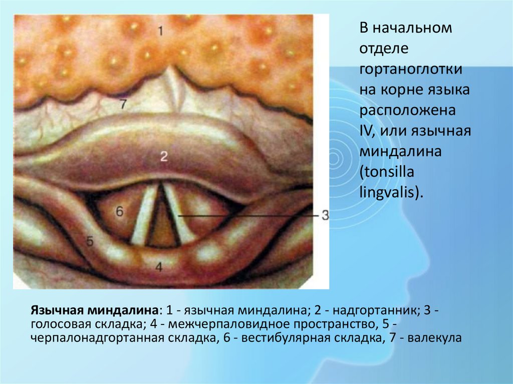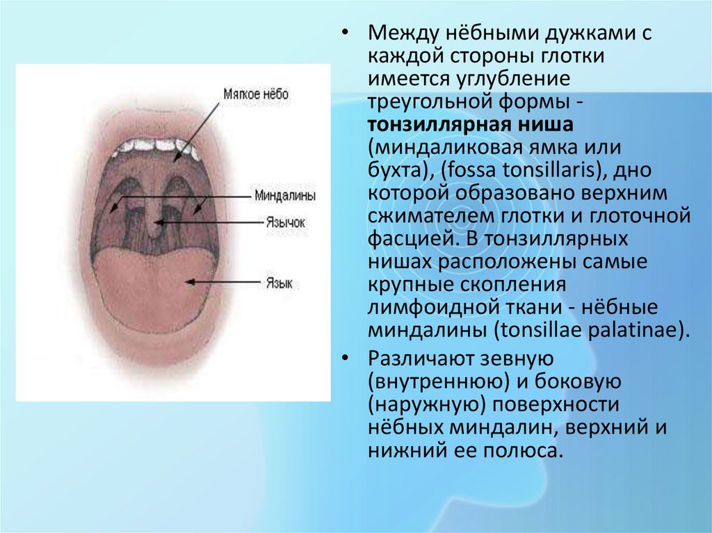• Между нёбными дужками скаждой стороны глотки