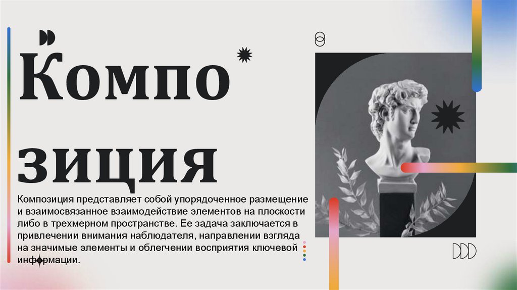 Композиция представляет собой упорядоченное размещениеи взаимосвязанное взаимодействие элементов на плоскости