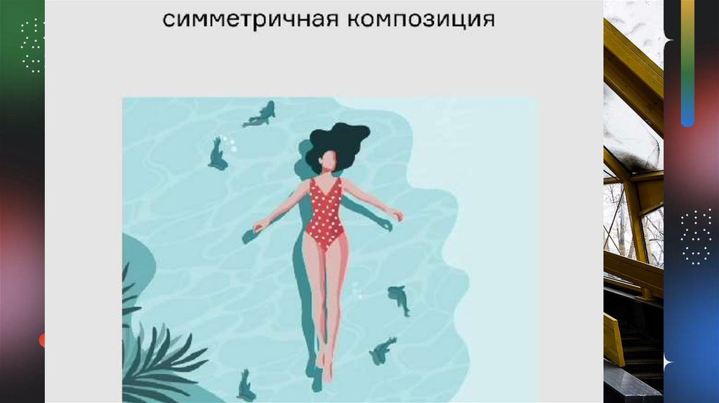 изображение мысленно делится на девять равных частей с помощью двухгоризонтальных и двух вертикальных линий. Главные элементы композиции