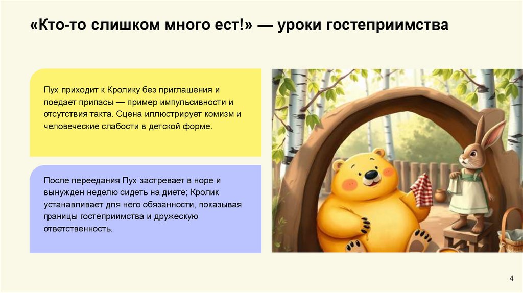 «Кто-то слишком много ест!» — уроки гостеприимстваПух приходит к Кролику без приглашения и
