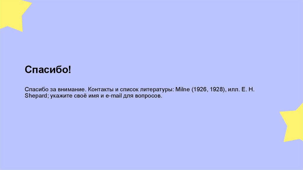 Спасибо!Спасибо за внимание. Контакты и список литературы: Milne (1926, 1928), илл. E. H.