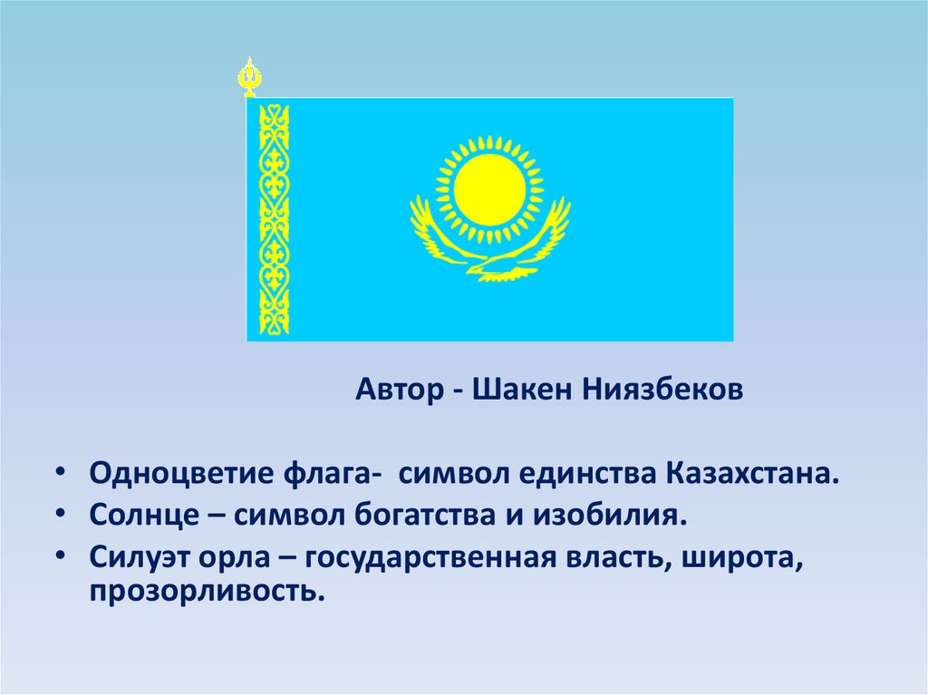 Автор - Шакен Ниязбеков• Одноцветие флага- символ единства Казахстана.