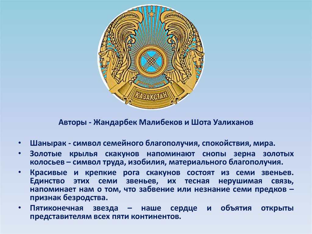 Авторы - Жандарбек Малибеков и Шота Уалиханов• Шанырак - символ семейного благополучия, спокойствия, мира.