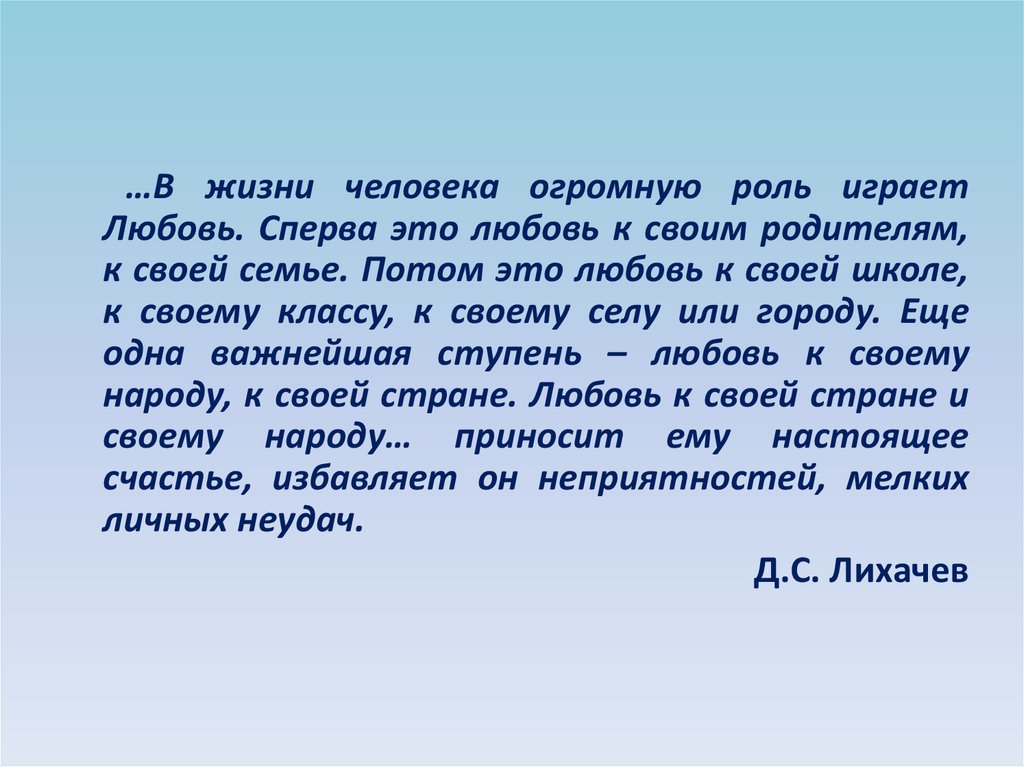 …В жизни человека огромную роль играетЛюбовь. Сперва это любовь к своим родителям,