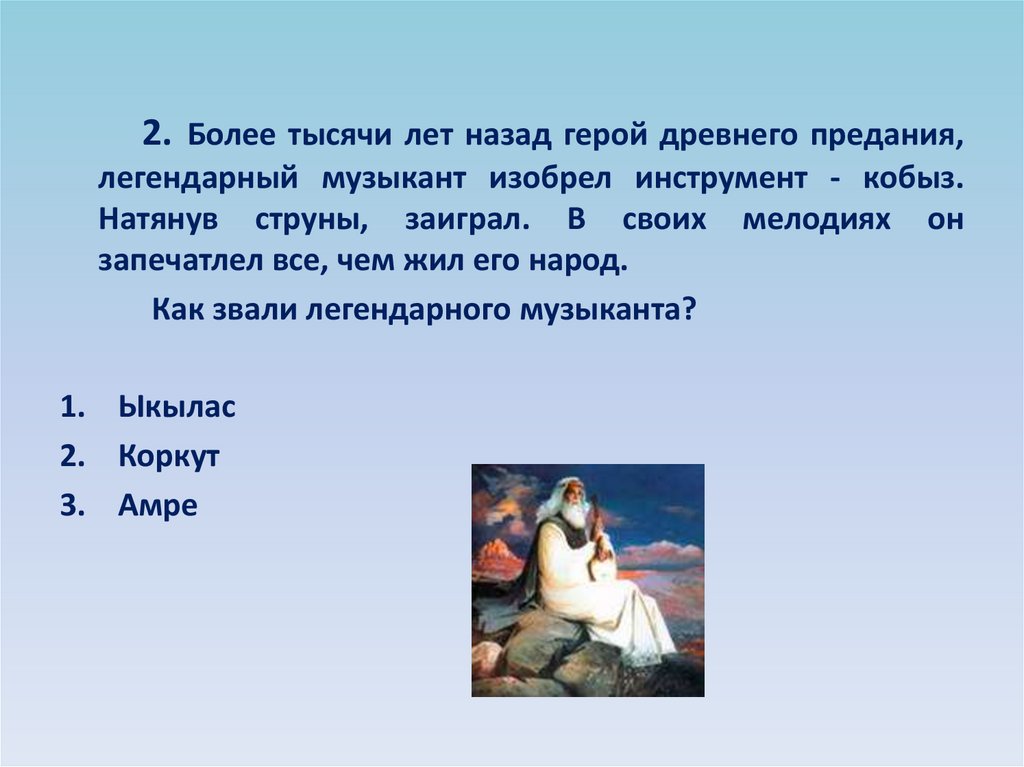 2. Более тысячи лет назад герой древнего предания,легендарный музыкант изобрел инструмент - кобыз.