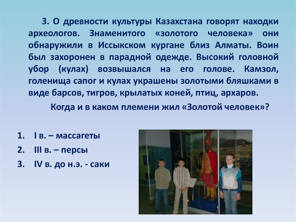 3. О древности культуры Казахстана говорят находкиархеологов. Знаменитого «золотого человека» они