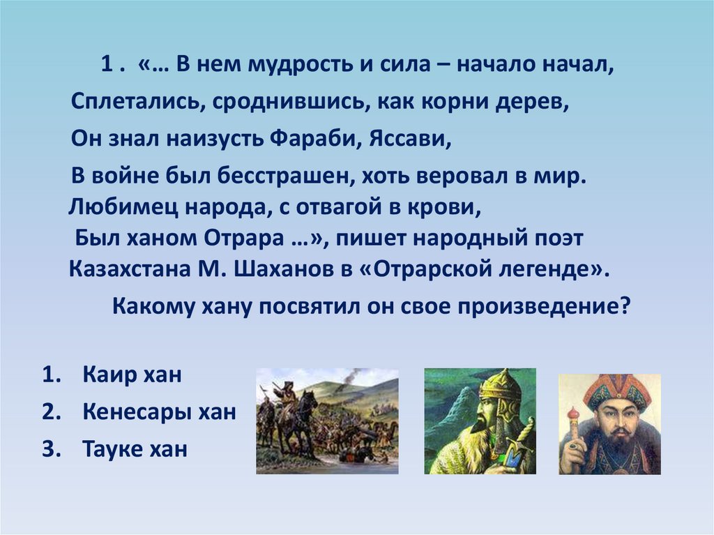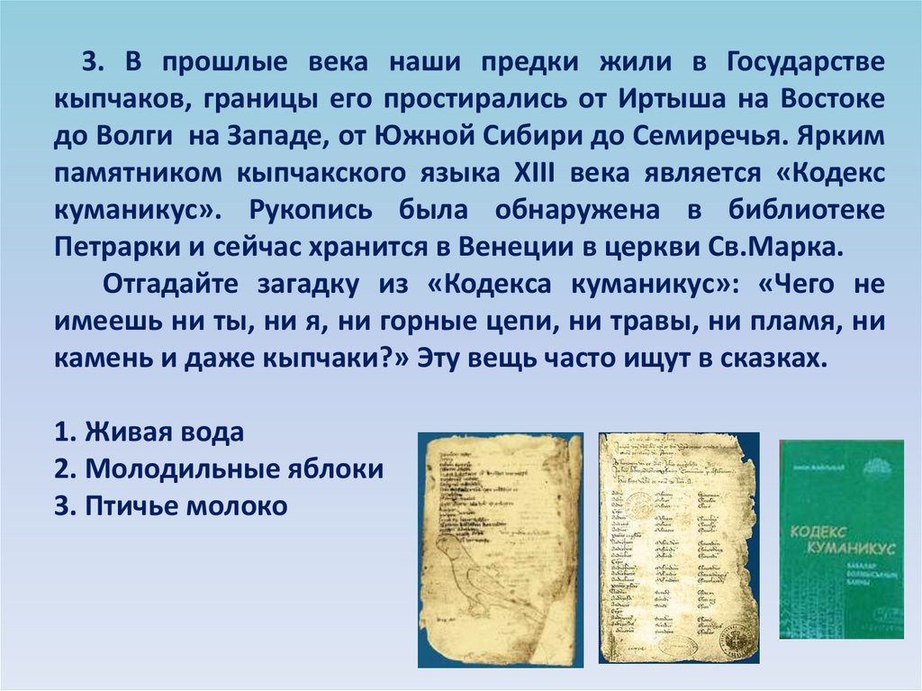 3. В прошлые века наши предки жили в Государствекыпчаков, границы его простирались от Иртыша на Востоке