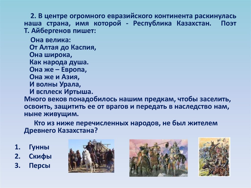 2. В центре огромного евразийского континента раскинуласьнаша страна, имя которой - Республика Казахстан. Поэт