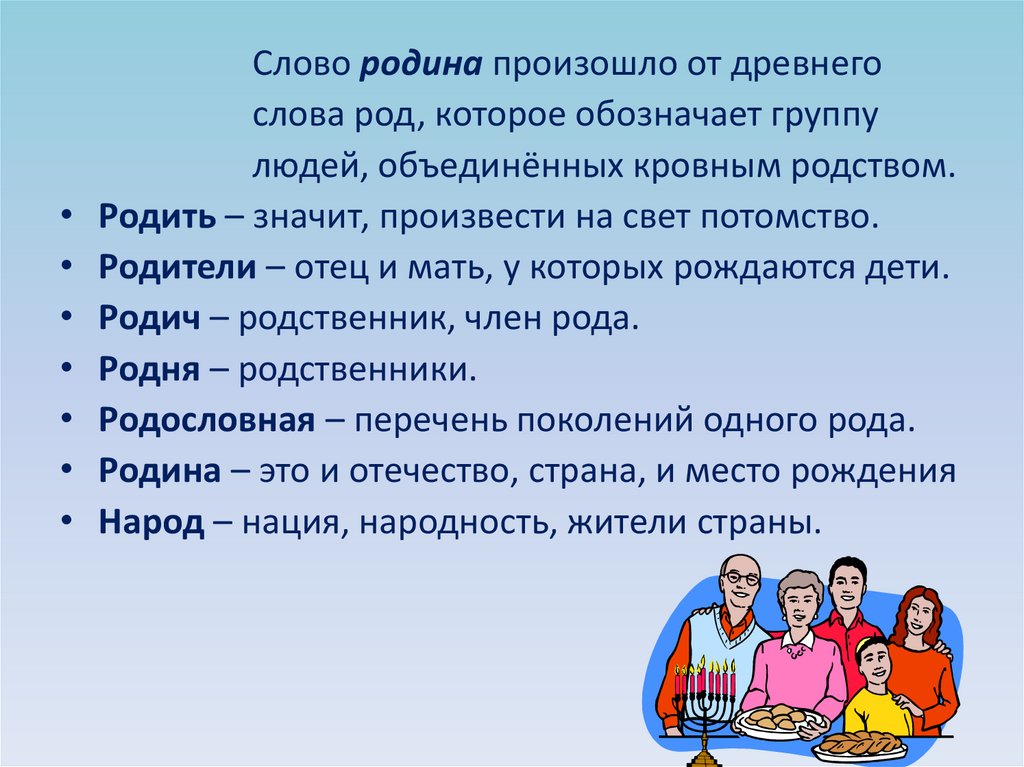 Слово родина произошло от древнегослова род, которое обозначает группу