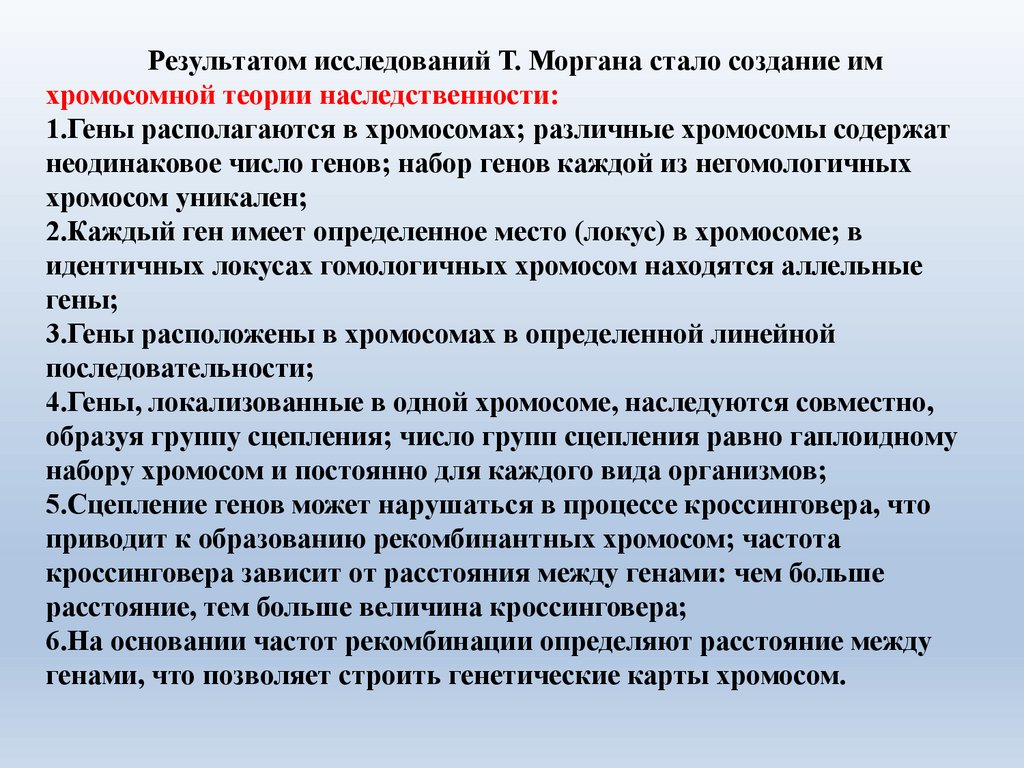 Результатом исследований Т. Моргана стало создание имхромосомной теории наследственности: