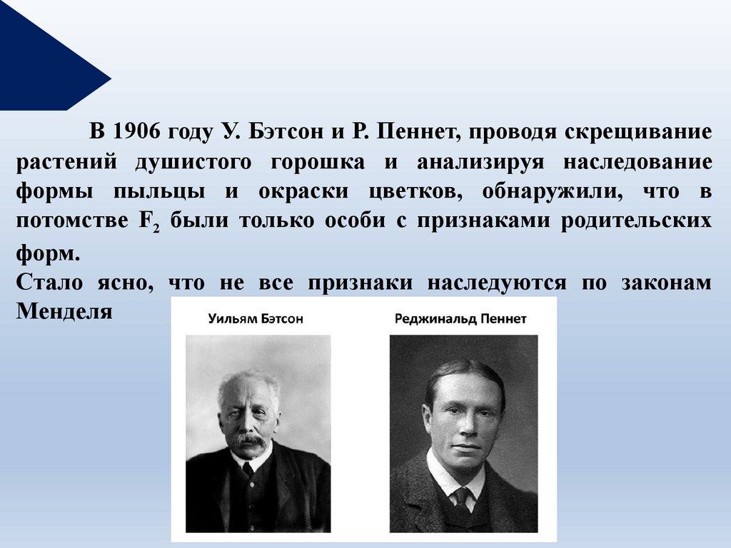 В 1906 году У. Бэтсон и Р. Пеннет, проводя скрещиваниерастений душистого горошка и анализируя наследование
