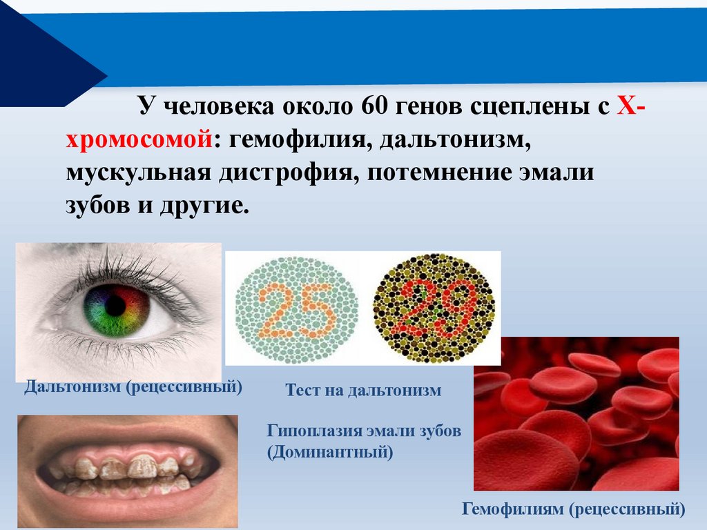 РЕМОНТУ человека около 60 генов сцеплены с Ххромосомой: гемофилия, дальтонизм,