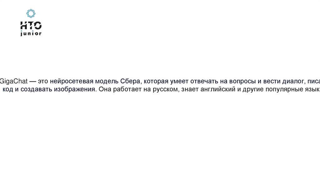 GigaChat — это нейросетевая модель Сбера, которая умеет отвечать на вопросы и вести диалог, писакод и создавать изображения. Она работает на русском, знает английский и другие популярные языки
