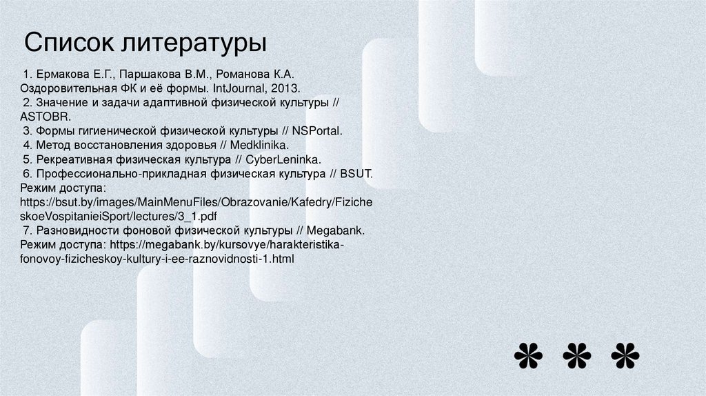 Список литературы1. Ермакова Е.Г., Паршакова В.М., Романова К.А.