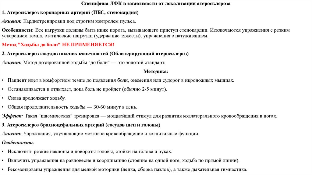 Специфика ЛФК в зависимости от локализации атеросклероза1. Атеросклероз коронарных артерий (ИБС, стенокардия)