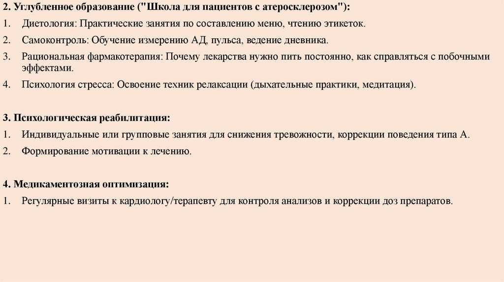 2. Углубленное образование ("Школа для пациентов с атеросклерозом"):1.
