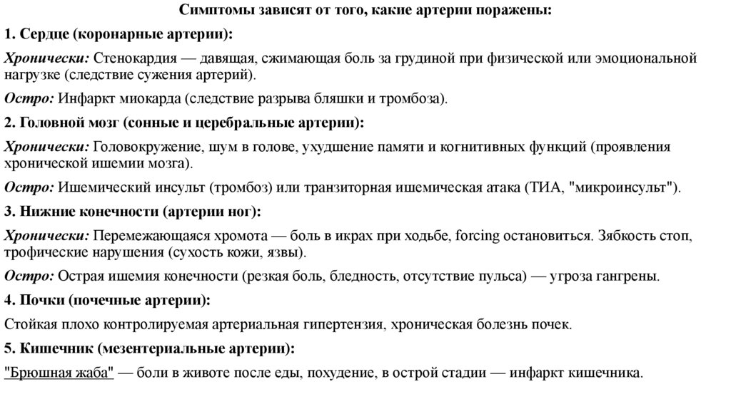 Симптомы зависят от того, какие артерии поражены:1. Сердце (коронарные артерии):