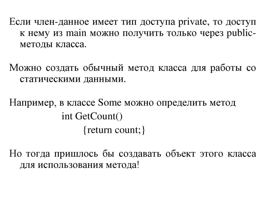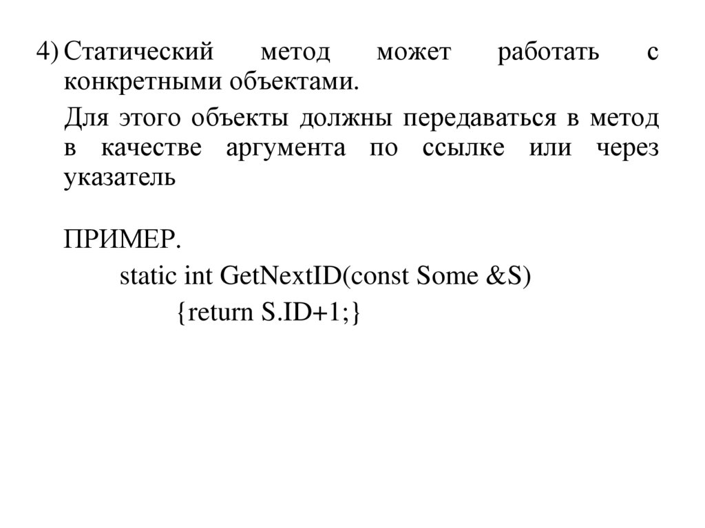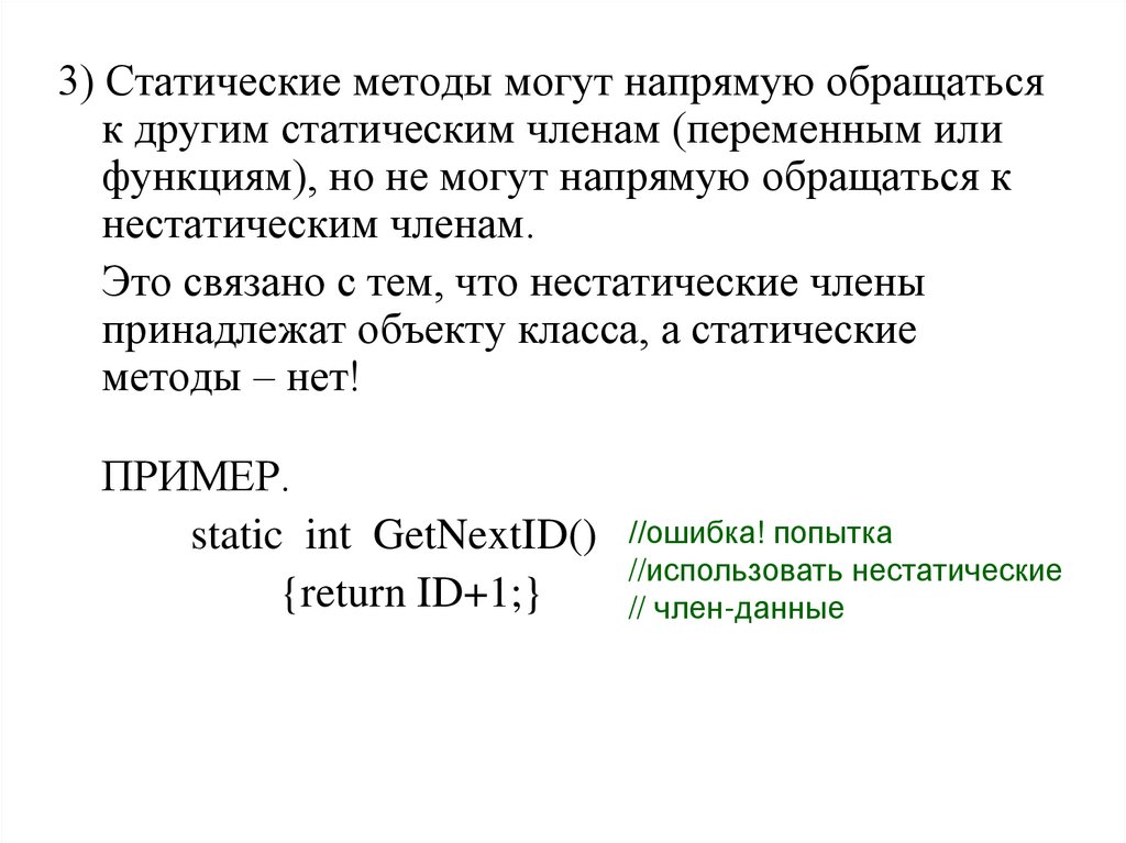 3) Статические методы могут напрямую обращатьсяк другим статическим членам (переменным или