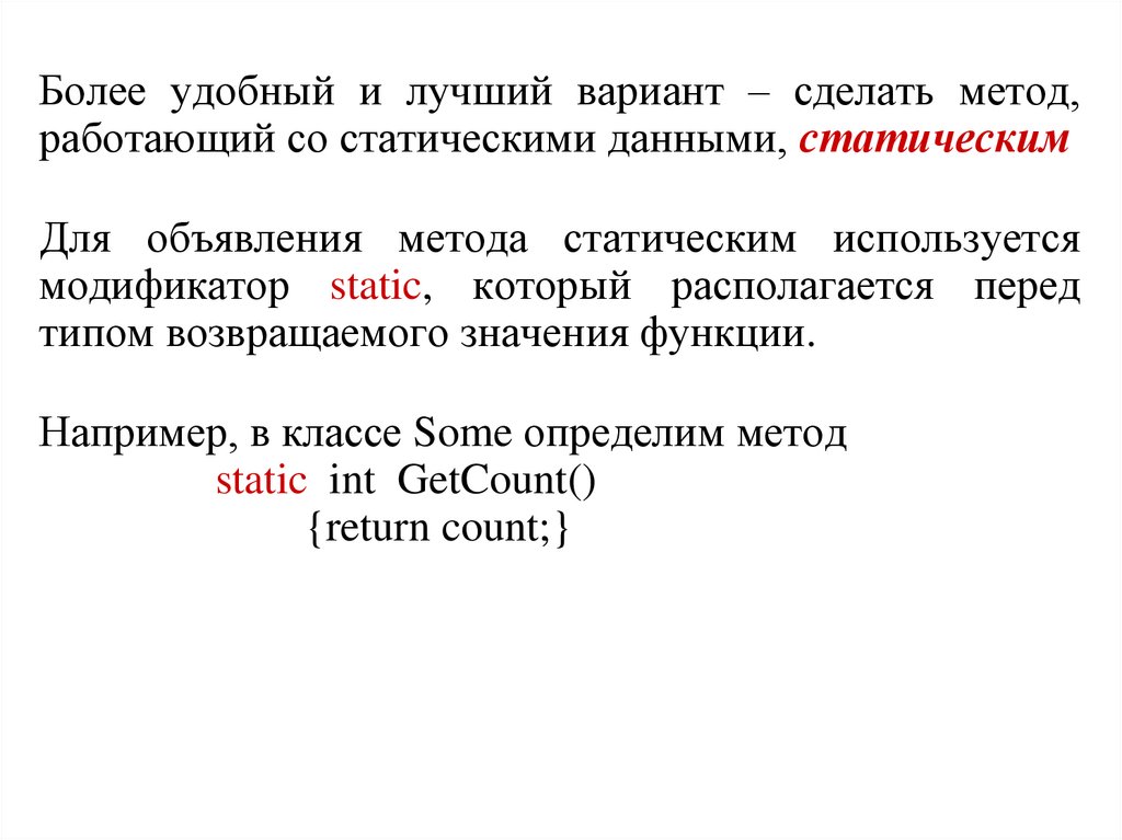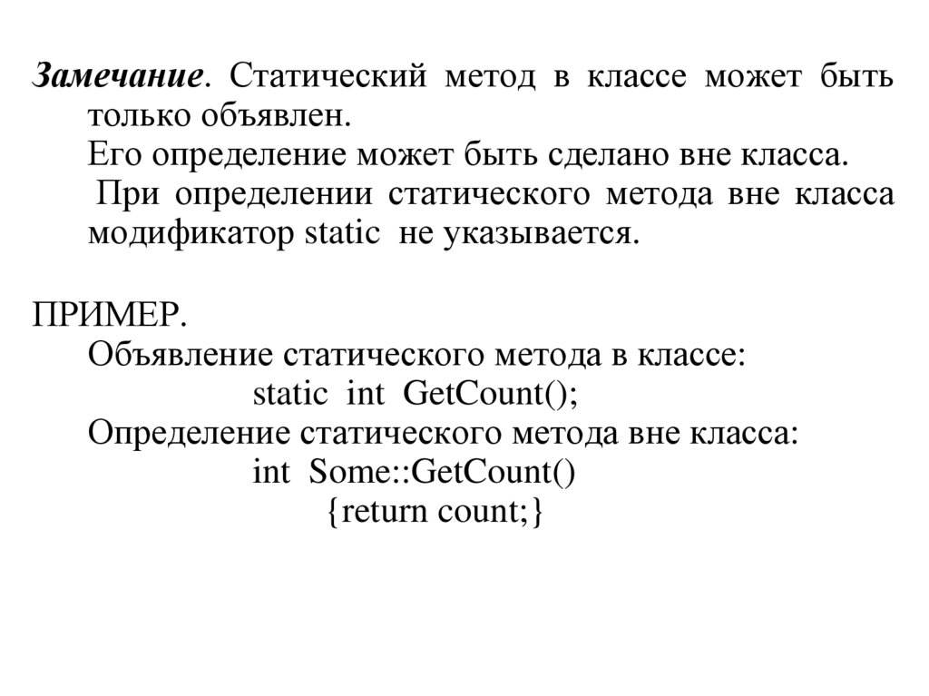 Замечание. Статический метод в классе может бытьтолько объявлен.