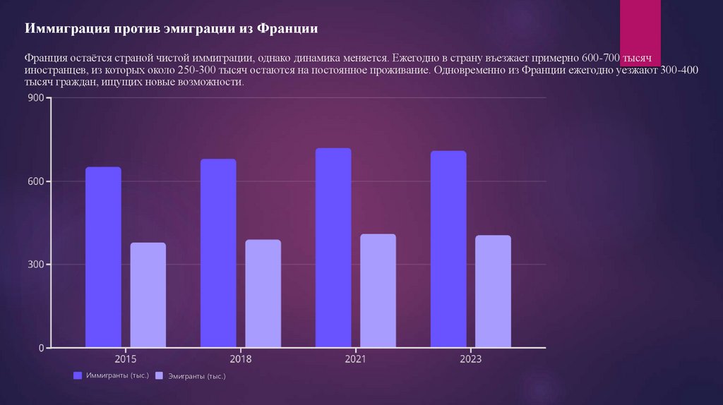 Иммиграция против эмиграции из ФранцииФранция остаётся страной чистой иммиграции, однако динамика меняется. Ежегодно в страну въезжает примерно 600-700 тысяч