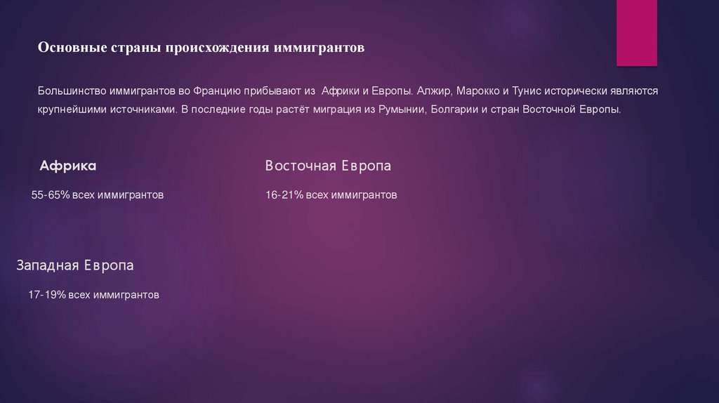 Основные страны происхождения иммигрантовБольшинство иммигрантов во Францию прибывают из Африки и Европы. Алжир, Марокко и Тунис исторически являются