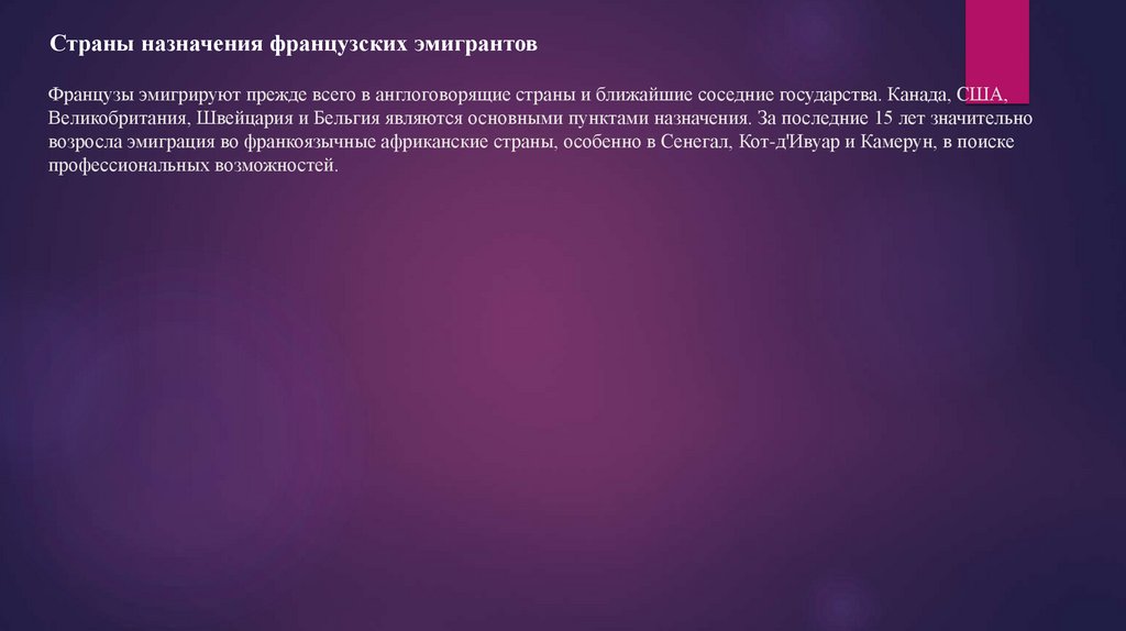 Страны назначения французских эмигрантовФранцузы эмигрируют прежде всего в англоговорящие страны и ближайшие соседние государства. Канада, США,