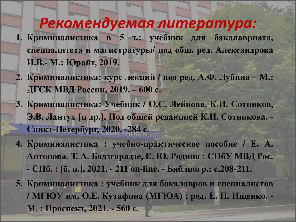 Рекомендуемая литература:1. Криминалистика в 5 т.: учебник для бакалавриата,